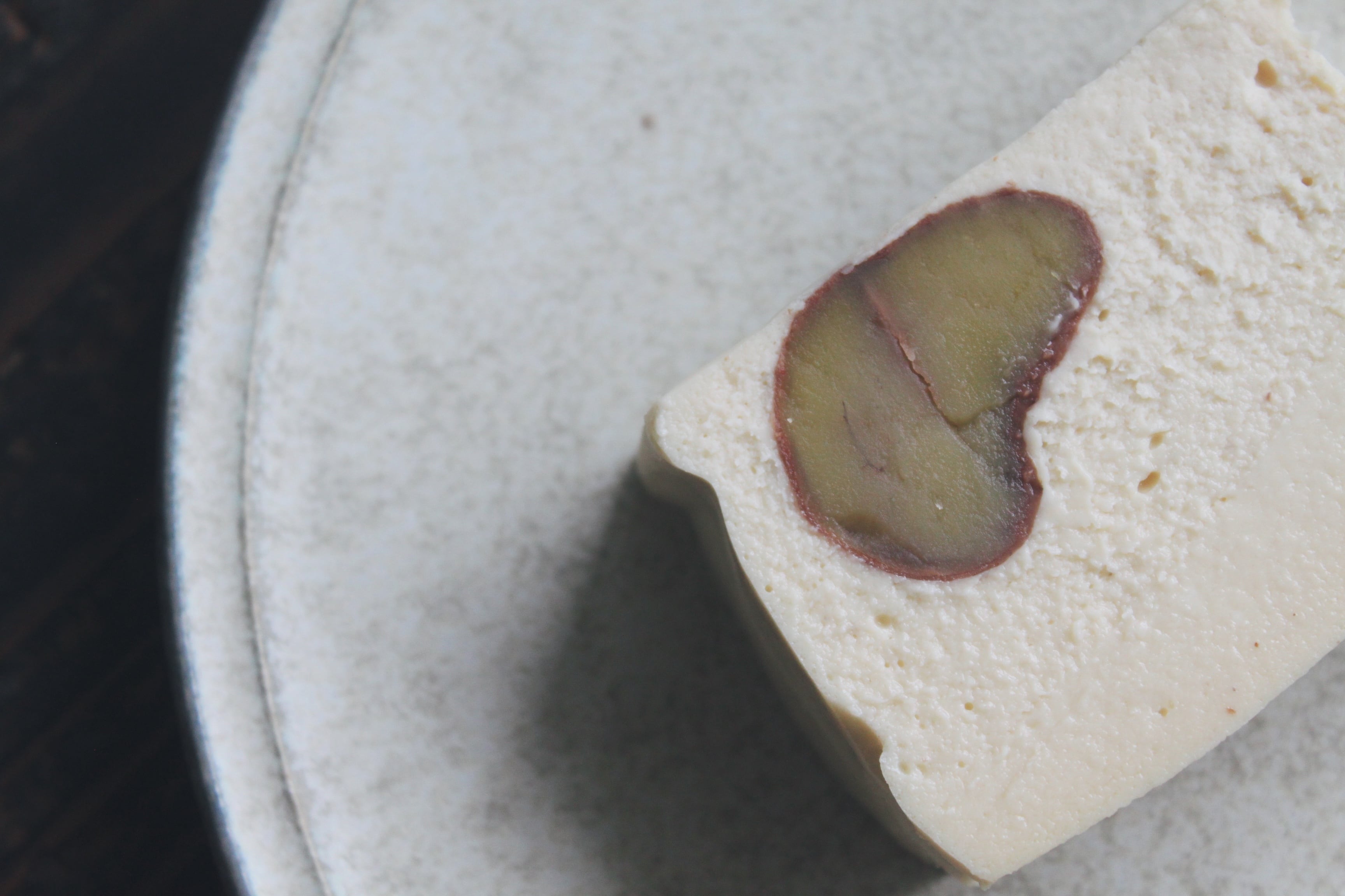 チーズケーキの生地はなめらかしっとり、酸味はすこし抑えて、栗のペーストも加えてほっくりやさしい甘さに。